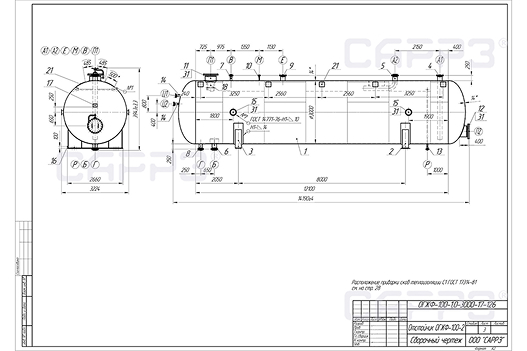 Пример выполненного сборочного чертежа горизонтального отстойника нефти ОГЖФ